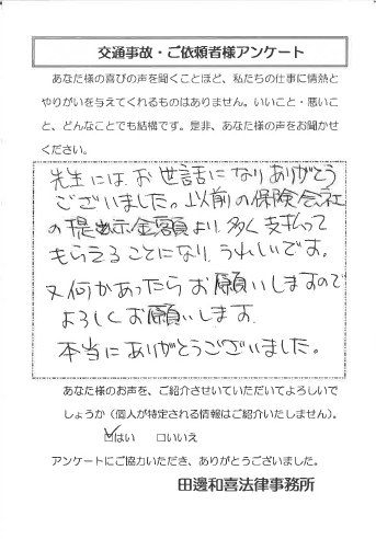 お客様の声No.38 先生には、お世話になりありがとうございました。 以前の保険会社の提示金額より、多く支払ってもらえることになり、うれしいです。 又何かあったらお願いしますので、よろしくお願いします。 本当にありがとうございました。 前へ 次へ