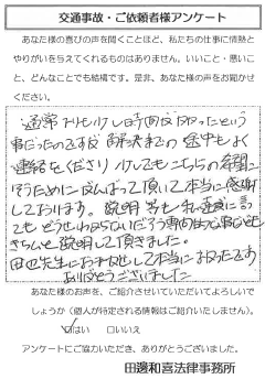 お客様の声No.44 通常よりも少し時間がかかったという事だったのですが、解決までの途中もよく連絡をくださり 少しでもこちらの希望に沿うために頑張って頂いて本当に感謝しております。 説明等も私達に言ってもどうせわからないだろう専門的なことなどもきちんと説明して頂きました。 田邊先生にお任せして本当によかったです。ありがとうございました。 前へ