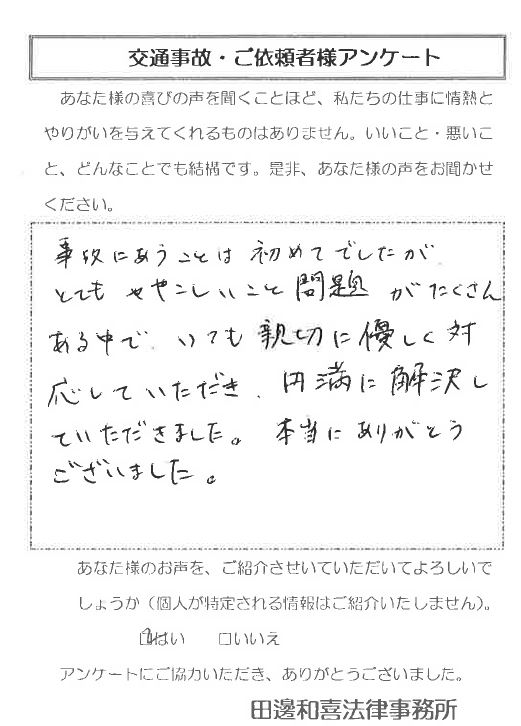 お客様の声No.48 事故に遭うことは初めてでしたが、とてもややこしい問題がたくさんあるなかで、 いつも親切に優しく対応していただき、円満に解決していただきました。 本当にありがとうございました。 前へ
