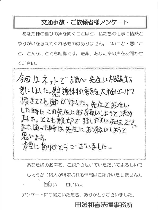 お客様の声No.52 今回はネットで調べ先生に相談することにしました。 慰謝料の額を大幅に上げていただきとても助かりました。 先生とお会いした時に、この先生にお願いしようと決めました。 とても親切で話しやすい先生です。 また困ったときは先生にお願いしようと思います。 本当にありがとうございました。 前へ