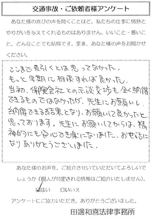 お客様の声No.54 ここまで長引くとは思っていなかった。 もっと早期に相談すれば良かった。 当初、保険会社との示談交渉も全く納得できるものではなかったが、先生にお願いし、 納得できる結果となり、お願いして良かったと思っております。 先生にお願いしてからは、精神的にも安心でき楽になりました。 お世話になりありがとうございました。 前へ