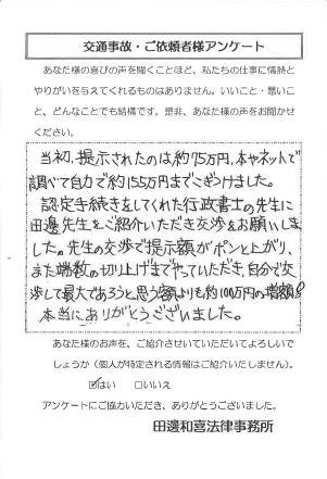 お客様の声No.57 当初、提示されたのはやく75万円、本やネットで調べて自力で約155万円までこぎつけました。 認定手続きをしてくれた行政書士の先生に田邊先生をご紹介いただき交渉をお願いしました。 先生の交渉で提示額がポンと上がり、また、端数の切り上げまでやっていただき、 自分で交渉して最大であろうと思う額よりも約100万円の増額! 本当にありがとうございました。 前へ 次へ